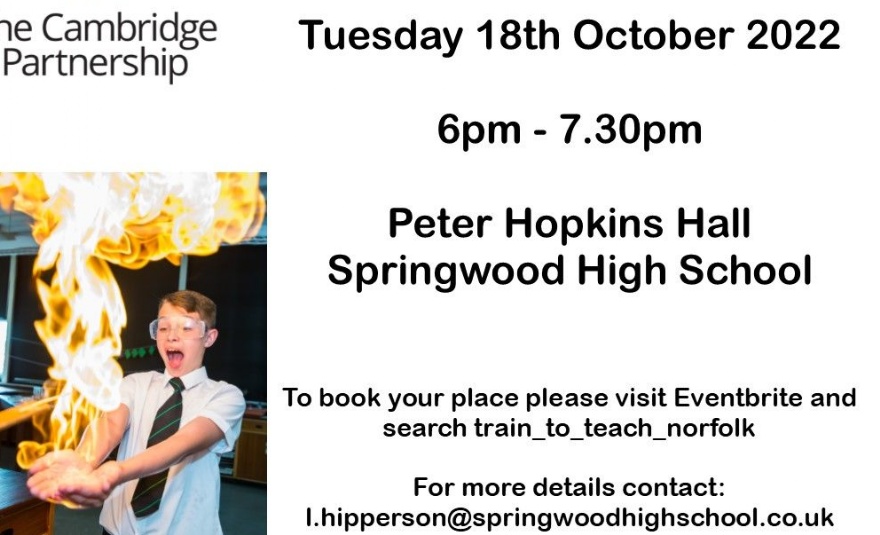 Join us at Springwood High School on Tuesday 18th October from 6pm to learn how to get into teaching. Listen to Directors of Local Training Providers advise what qualifications and experience you need to train to teach and what you will experience on your training course. Speak with Senior Leaders from West Norfolk Academies Trust about opportunities within their schools to train to teach and employment beyond training.